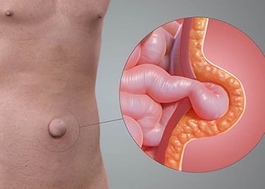 Protuberância visível: uma saliência ou inchaço que pode ser observado e, às vezes, sentido na área afetada, especialmente ao tossir, levantar peso ou durante atividade física.